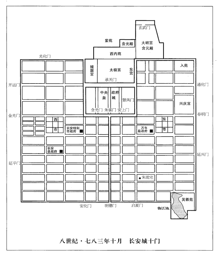 鳳翔、涇原將張廷芝、段誠諫將數千人救襄城,原將,即亮翻;諫將音同,又音如字。未出潼關,聞朱泚據長安,殺其大將隴右兵馬使戴蘭,潰歸於泚。泚先帥鳳翔、涇原,故二鎮之兵聞亂皆歸之。潼,音同。使,疏吏翻。泚於是自謂眾心所歸,謀反遂定。以源休為京兆尹、判度支,度,徒洛翻。李忠臣為皇城使。唐六典:皇城在京城之中,東西五里,一百一十五步,南北三里,一百四十步。南面三門,中曰朱雀,左曰安上,右曰含光。東面二門,北曰延喜,南曰景風。西面二門,北曰安福,南曰順義。其中,右社稷,左宗廟,百僚廨署列乎其間。唐自開元以前,以城門郎掌皇城諸門開闔之節,中世以後,置皇城使。百司供億,六軍宿衛,咸擬乘輿。乘,繩證翻。