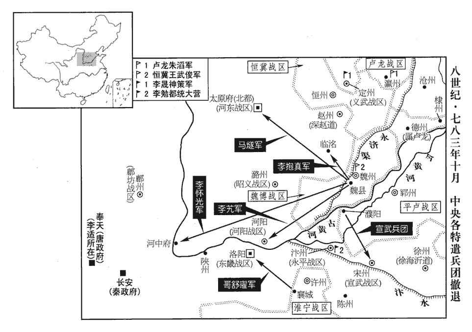 32上遣中使告難於魏縣‹河北省大名县西南›行營,魏縣行營,馬燧諸軍之討田悅者。難,乃旦翻。諸將相與慟哭。李懷光帥眾赴長安,為李懷光救奉天、破朱泚張本。帥,讀曰率馬燧、李芃péng各引兵歸鎮,馬燧歸太原‹山西省太原市›,李芃歸河陽‹河南省孟州市›。李抱真退屯臨洺‹河北省永年县›。