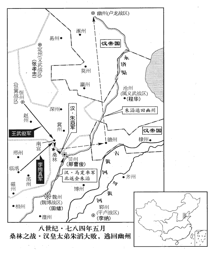 丙子‹六›旦,武俊遣其兵馬使趙琳將五百騎伏於桑林‹河北省广宗县东北›,桑林之地,在經城西南。抱真列方陳於後,陳,讀曰陣;下同。武俊引騎兵居前,自當回紇。回紇縱兵衝之,武俊使其騎控馬避之。回紇突出其後,將還,武俊乃縱兵擊之,趙琳自林中出橫擊之,回紇敗走。武俊急追之,滔騎兵亦走,自踐其步陳,步騎皆東奔,滔不能制,遂走趣其營,趣,七喻翻;下同。抱真、武俊合兵追擊之。時滔引三萬人出戰,死者萬餘人,逃潰者亦萬餘人,滔纔與數千人入營堅守。會日暮,昏霧,兩軍不能進,抱真軍其營之西北,武俊軍其東北。滔夜焚營,引兵出南門,趣德州遁去,委棄所掠資財山積;兩軍以霧,不能追也。