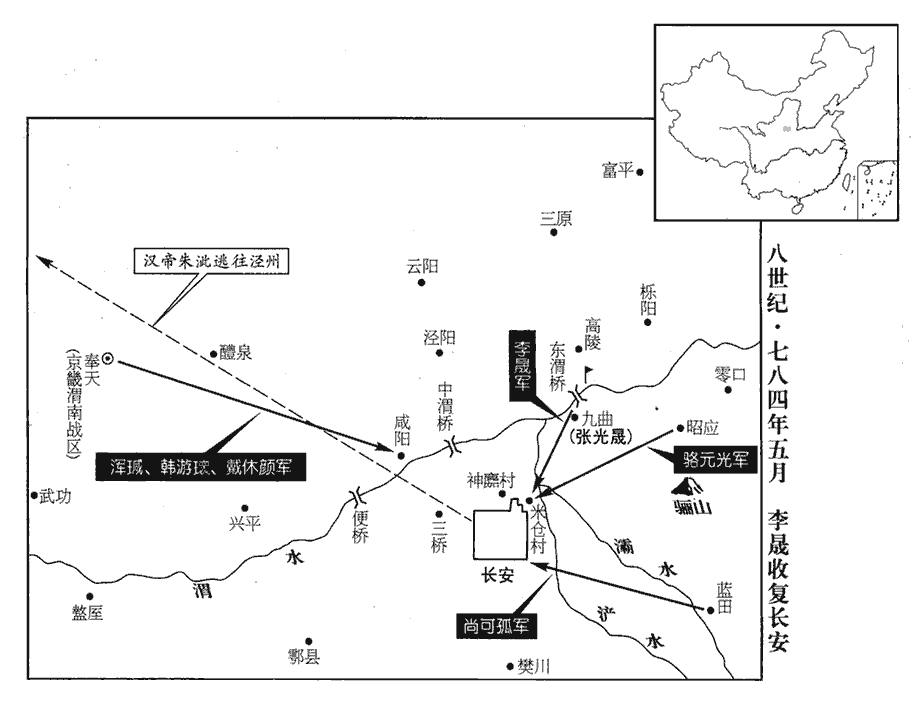 壬辰‹二十二›,尚可孤敗泚將仇敬忠於藍田西,斬之。敗,補邁翻。乙未‹二十五›,李晟移軍於光泰門外米倉村‹长安城东北›。光泰門,苑城東北門。程大昌曰:光泰門在通化門北,小城之東門,門東七里有長樂坡。呂大防長安圖:光泰門者,京城東門,大明宮東苑之東。丙申‹二十六›,晟方自臨築壘,泚驍將張庭芝、李希倩引兵大至,晟謂諸將曰:「始吾憂賊潛匿不出,今來送死,此天贊我,不可失也!」命副元帥兵馬使吳詵shēn等縱兵擊之。時華州營在北,兵少,華州兵,駱元光之兵。華,戶化翻。少,詩沼翻。賊併力攻之,晟命牙前將李演等帥精兵救之。演等力戰,賊敗走;演等追之,乘勝入光泰門;再戰,又破之。會夜,晟斂兵還。賊餘眾走入白華門,白華殿門也。夜,聞慟哭。希倩,希烈之弟也。