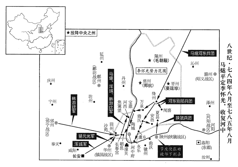 7李懷光‹驻山西省永济市›都虞候呂鳴岳密通款於馬燧‹河东战区,总部设太原府山西省太原市›,事泄,懷光殺之,屠其家。事連幕僚高郢、李鄘,懷光集將士而責之,郢、鄘抗言逆順,無所慙隱,懷光囚之。鄘,邕之姪孫也。李邕以讒死於天寶之末。馬燧軍寶鼎‹山西省万荣县西南荣河镇›,敗懷光兵於陶城‹山西省永济市西北›,敗,補邁翻。唐書地理志:河中有陶城府。酈道元曰:陶城,在蒲坂城西北,即舜所都也。舜陶河濱,蓋即此地,與歷山相近。按唐河中府治河東縣。河東,古蒲坂也。斬首萬餘級;分兵會渾瑊,逼河中。