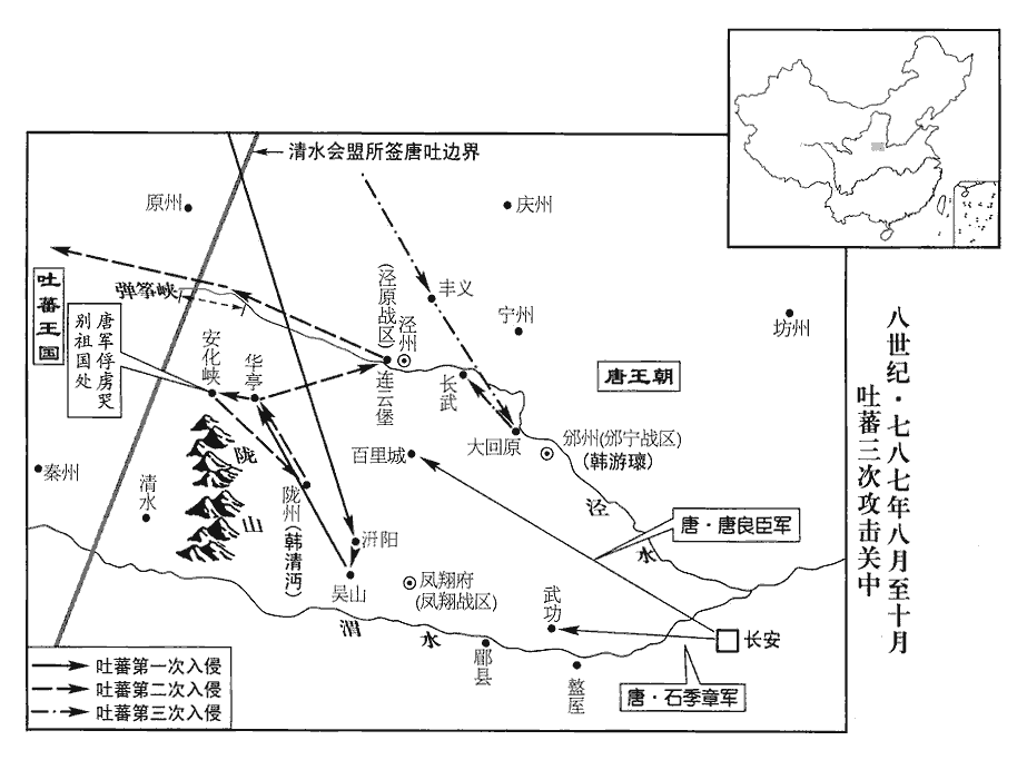 9冬,十月,甲申‹四›,吐蕃寇豐義城‹甘肃省镇原县东›,武德二年,分彭原置豐義縣,屬寧州。宋白曰:彭陽縣,後魏於縣置雲州,周武保定二年,廢州為防,隋文帝廢防為豐義城,唐武德初分彭原縣為豐義縣,屬彭州,貞觀廢彭州,以縣屬寧州,其城即後魏雲州城。前鋒至大回原‹地望应在陕西省彬县西北›,邠寧節度使韓遊瓌擊卻之:乙酉‹五›,復寇長武城‹陕西省长武县西北›,復,扶又翻。又城故原州而屯之。