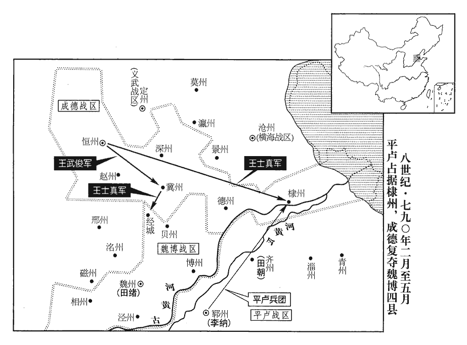 2初,朱滔‹卢龙战区,总部设幽州北京市›敗於貝州‹河北省清河县›,見二百三十一卷興元元年。其棣州‹山东省惠民县›刺史趙鎬以州降於王武俊‹成德战区,总部设恒州河北省正定县›,既而得罪於武俊,召之不至。田緒‹魏博战区,总部设魏州河北省大名县›殘忍,其兄朝,仕李納‹平卢战区,总部设郓州山东省东平县›為齊州‹山东省济南市›刺史。或言納欲納朝於魏‹河北省大名县›,緒懼;判官孫光佐等為緒謀,厚賂納,且說納招趙鎬取棣州以悅之,為,于偽翻。說,式芮翻。因請送朝於京師;納從之。丁酉‹三十›,鎬以棣州降于納。三月,武俊使其子士真擊之,不克。