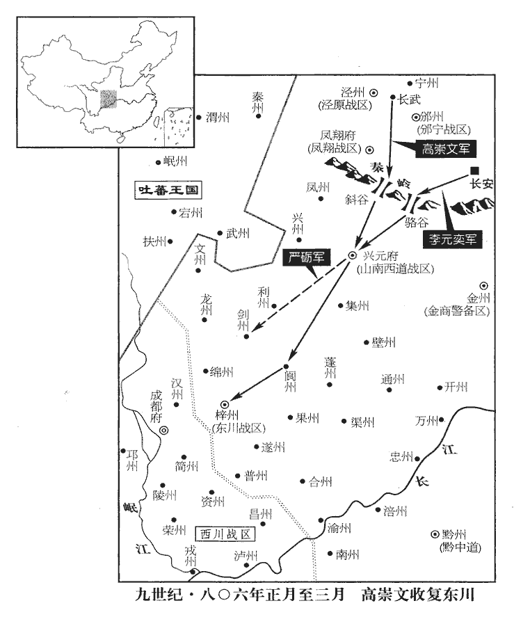 高崇文屯長武城‹陕西省长武县西北›,練卒五千,常如寇至,卯時受詔,辰時即行,器械糗糧,糗,去久翻。熬米麥為糗。一無所闕。甲午‹二十九›,崇文出斜谷‹陕西省太白县境›,斜,昌遮翻。谷,音浴,又如字。李元奕出駱谷‹陕西省周至县西南›,同趣梓州‹四川省三台县›。崇文軍至興元‹陕西省汉中市›,軍士有食於逆旅,折人匕筯者,崇文斬之以徇。折,而設翻。