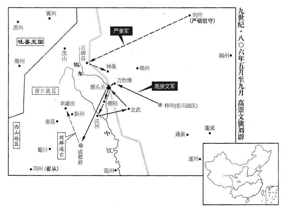 22劉闢城鹿頭關‹四川省德阳市北黄许镇›,連八柵,屯兵萬餘人以拒高崇文。六月,丁酉‹五›,崇文擊敗之。敗,補邁翻。闢置柵於關東萬勝堆‹四川省德阳市东北›。戊戌‹六›,崇文遣驍將范陽‹河北省涿州市›高霞寓攻奪之,下瞰關城;瞰,古濫翻。凡八戰皆捷。