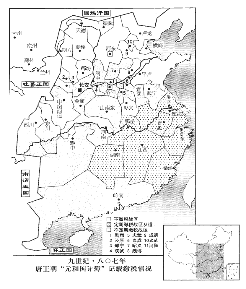 17是歲,李吉甫撰《元和國計簿》上之,上,時掌翻。總計天下方鎮四十八,州府二百九十五,縣千四百五十三。其鳳翔‹总部设凤翔府陕西省凤翔县›、鄜坊‹总部设鄜州陕西省富县›、邠寧、振武‹总部设单于府内蒙古和林格尔县›、涇原‹总部设泾州甘肃省泾川县›、銀夏‹总部设夏州陕西省靖边县北白城子›、靈鹽‹总部设灵州宁夏灵武市›、河東‹总部设太原府山西省太原市›、易定‹总部设定州河北省定州市›、魏博‹总部设魏州河北省大名县›、鎮冀‹总部设恒州河北省正定县›、范陽、滄景‹总部设沧州河北省沧州市东南›、淮西‹总部设蔡州河南省汝南县›、淄青‹总部设郓州山东省东平县›等十五道七十一州不申戶口外,鳳翔、鄜坊、邠寧、振武、涇原、銀夏、靈鹽、河東皆被邊,易定、魏博、鎮冀、范陽、滄景、淮西、淄青皆藩鎮世襲,故並不申戶口,納賦稅。夏,戶雅翻。每歲賦稅倚辦止於浙江東•西、宣歙、淮南、江西、鄂岳、福建‹首府设福州福建省福州市›、湖南‹首府设潭州湖南省长沙市›八道四十九州,一百四十四萬戶,比天寶稅戶四分減三。宋白曰:國計簿比較數:天寶州郡三百一十五,元和見管總二百九十五,比較天寶應供稅州郡計少九十七;天寶戶總八百三十八萬五千二百二十三,元和見在戶總二百四十四萬二百五十四,比較天寶數稅戶通計少百九十四萬四千六百九十九;天寶租稅、庸、調每年計錢,粟、絹、布、絲、綿約五千二百三十餘萬端、匹、屯、貫、石,元和兩稅、榷酒、斛㪷dǒu、鹽利、茶利總三千五百一十五萬一千二百二十八貫、石,比較天寶所入賦稅計少一千七百一十四萬八千七百七十貫、石。歙,書涉翻。天下兵仰給縣官者八十三萬餘人,仰,牛向翻。比天寶三分增一,大率二戶資一兵。其水旱所傷,非時調發,不在此數。水旱所傷,則量減賦稅。非時調發,則出於常賦之外。調,徒釣翻。