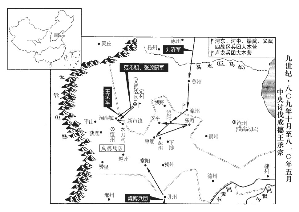 1春,正月,劉濟‹卢龙战区,总部设幽州北京市›自將兵七萬人擊王承宗‹成德战区,总部设恒州河北省正定县›,時諸軍皆未進,濟獨前奮擊,拔饒陽‹河北省饶阳县›、束鹿‹河北省辛集市›。