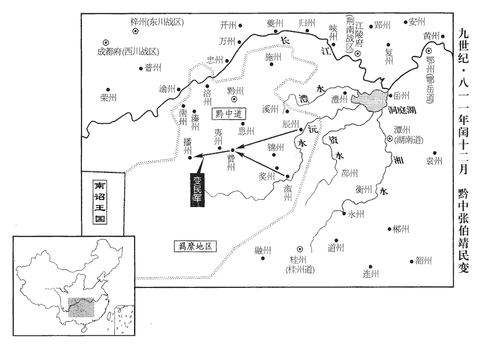 18閏月,辛卯朔‹一›,黔州奏:辰‹湖南省沅陵县›、漵‹湖南省洪江市西北黔城镇›賊帥張伯靖寇播州‹贵州省遵义市›、費州‹贵州省思南县›。漵,音敘。