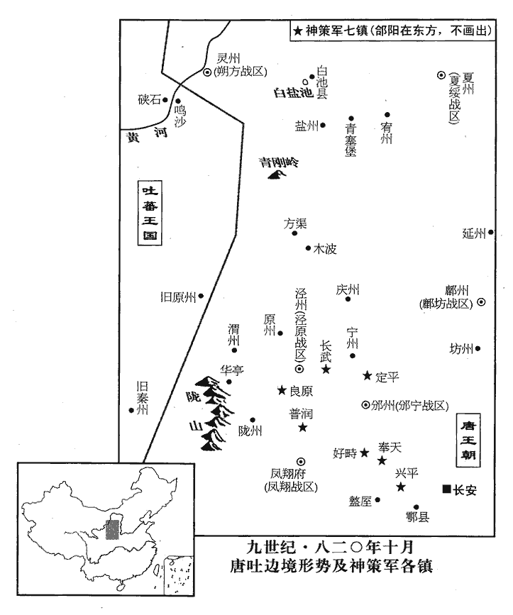 34癸未‹十四›,涇州‹甘肃省泾川县›奏吐蕃進營距州三十里,告急求救;以右軍中尉梁守謙為左•右神策、京西•北行營都監,將兵四千人,并發八鎮全軍救之;左,右神策軍分屯近畿,凡八鎮,長武‹陕西省长武县西北›、興平‹陕西省兴平市›、好畤‹陕西省永寿县西南›、普閏‹陕西省凤翔县北›、郃陽‹陕西省合阳县›、良原‹甘肃省灵台县西梁原镇›、定平‹甘肃省正宁县西南›、奉天‹陕西省乾县›也。宋白所記與此稍異。賜將士裝錢二萬緡。以郯王府長史邵同為太府少卿兼御史中丞,充答吐蕃請和好使。郯王經,順宗子也。將,即亮翻。緡,彌巾翻。郯,音談。長,知兩翻。少,始照翻。好,呼到翻。使,疏吏翻。