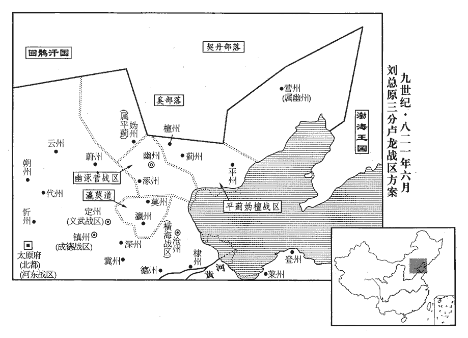 16初,劉總奏分所屬為三道:以幽、涿、營為一道,請除張弘靖為節度使;平、薊、媯、檀為一道,請除平盧‹总部设青州山东省青州市›節度使薛平為節度使;瀛、莫‹首府设瀛州河北省河间市›為一道,請除權知京兆尹盧士玫為觀察使。釋名曰:幽州在北,幽昧之地,故曰幽,西南至涿州一百二十里。營州,以營室分為名。幽、涿接境。營州治柳城,道里絕遠。劉總奏以為一道,必有說。平州西至薊州二百里。薊州西北至檀州二百十七里。檀州西至媯州二百五十里。瀛州北至莫州二百一十里。玫,莫回翻。