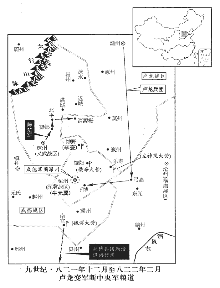 己亥‹七›,度支饋滄州‹河北省沧州市东南›糧車六百乘,至下博,盡為成德軍所掠。時諸軍匱乏,供軍院所運衣糧,往往不得至院,此時供軍院置於行營者,謂之北供軍院;度支自南供軍院運以給之。乘,繩證翻。在塗為諸軍邀奪,其懸軍深入者,皆凍餒無所得。