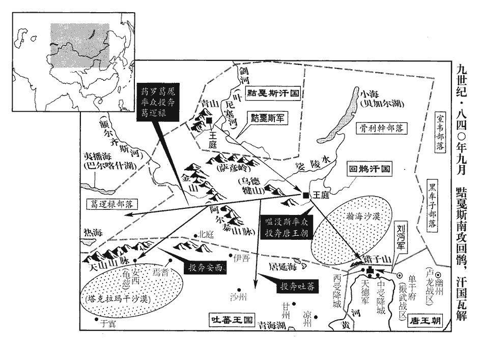 九月,以劉沔‹河东总部太原府›兼招撫回鶻使,如須驅逐,其諸道行營兵權令指揮;以張仲武‹卢龙总部幽州›為東面招撫回鶻使,其當道行營兵及奚、契丹、室韋‹内蒙古东北部›等並自指揮。以李思忠為河西‹陕西省北部›党項都將回鶻西南面招討使;此河西,謂北河之西。皆會軍于太原。令沔屯鴈門關‹山西省代县北›。鴈門關在代州鴈門縣,即陘岭關。
