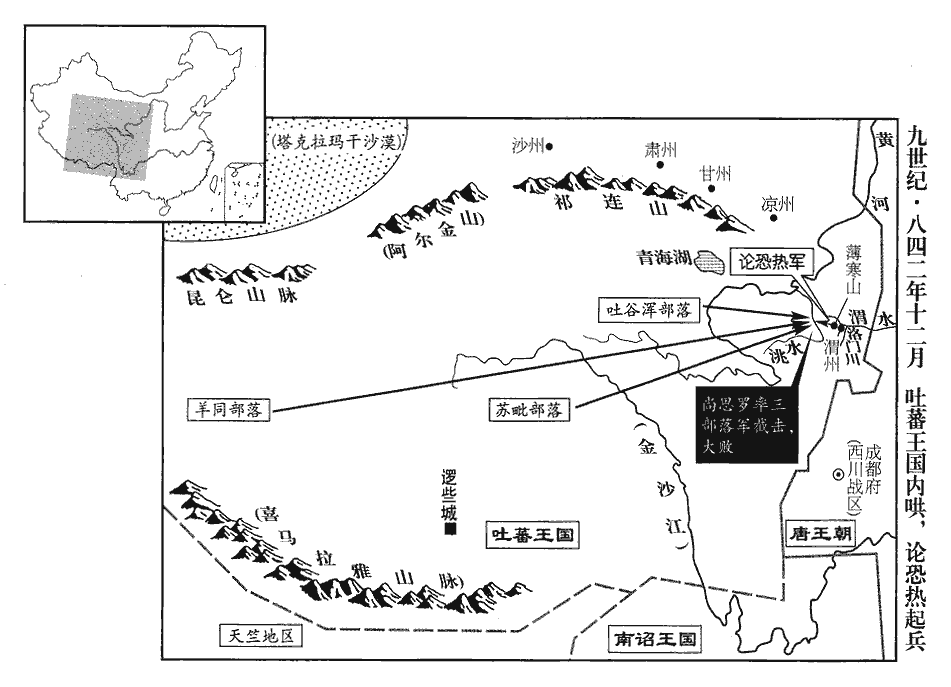 洛門川‹甘肃省武山县东南›討擊使論恐熱,洛門川在渭州隴西縣東南,漢來歙破隗純於落門,即此。考異曰:補國史曰:恐熱姓末,名農力。吐蕃國法不呼本姓,但王族則曰論,官族則曰尚,其中字即蕃號也。熱者,例皆言之,如中華呼郎。性悍忍,多詐謀,乃屬其徒告之曰:屬,之欲翻,聚會其徒也。「賊捨國族立綝氏,專害忠良以脅眾臣,且無大唐冊命何名贊普!吾當與汝屬舉義兵,入誅綝妃及用事者以正國家。天道助順,功無不成。」遂說三部落,得萬騎。三部落,吐蕃種落之分居河、隴者;或云,吐渾、党項、嗢末。說,式芮翻。是歲,與青海‹青海省›節度使同盟舉兵,自稱國相。