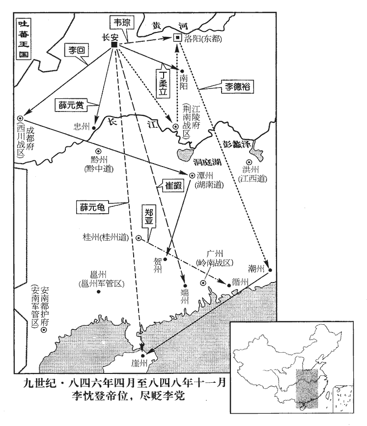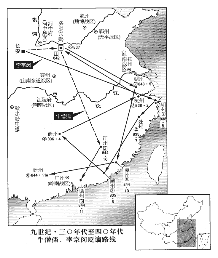 10秋,九月,甲子‹八›,再貶潮州‹广东省潮州市›司馬李德裕為崖州‹海南省琼山市›司戶,湖南觀察使李回為賀州‹广西贺县›刺史。崖州去京師七千四百六十里。賀州,京師東南四千一百三十里。