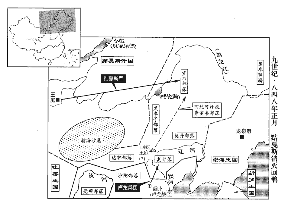 4回鶻遏捻可汗仰給於奚‹滦河上游›王石舍朗;仰,牛向翻。及張仲武大破奚眾,見去年五月。回鶻無所得食,日益耗散,至是,所存貴人以下不滿五百人,依於室韋‹内蒙古东北部›。使者入賀正,此回鶻使者也。過幽州,張仲武使歸取遏捻等;遏捻聞之,夜與妻葛祿、子特勒毒斯等九騎西走,餘眾追之不及,相與大哭。室韋分回鶻餘眾為七,七姓共分之;室韋有嶺西部、山北部、黃頭部、如者部、婆萵wō部、訥北部、駱丹部,凡七姓,悉居柳城東北,近者三千里,遠者六千里而贏。居三日,黠戛斯‹瀚海沙漠群›遣其相阿播帥諸胡兵號七萬來取回鶻,帥,讀曰率。大破室韋,悉收回鶻餘眾歸磧北。猶有數帳,潛竄山林,鈔盜諸胡;鈔,楚交翻。其別部厖勒,先在安西‹新疆库车县›,亦自稱可汗,居甘州‹甘肃省张掖市›,總磧西諸城,種落微弱,時入獻見。見,賢遍翻。回鶻至五季時入獻見者皆厖勒種類也。種,章勇翻。