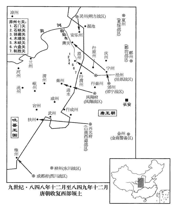 10涇原‹总部设泾州甘肃省泾川县›節度使康季榮取原州原州本治高平,安、史亂後沒於吐蕃。及石門、驛藏、木峽、制勝、六磐、石峽六關。秋,七月,丁巳‹六›,靈武‹宁夏灵武市›節度使朱叔明取長樂州。「長樂」當作「安樂」。宋白曰:安樂州置於靈州鳴沙縣。樂,音洛;下同。甲子‹十三›,邠寧‹总部设邠州陕西省彬县›節度使張君緒取蕭關‹宁夏同心县›。蕭關縣,舊志,屬原州。甲戌‹二十三›,鳳翔‹总部设凤翔府陕西省凤翔县›節度使李玭pín取秦州‹甘肃省秦安县西北›。玭,蒲蠲juān翻。凡取,言易也。秦州本治上邽。宋白曰:時治成紀,在舊州南一百里。詔邠寧節度權移軍於寧州‹甘肃省宁县›以應接河西。