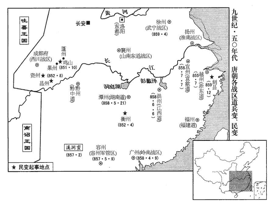 12浙東‹首府设越州浙江省绍兴市›賊帥裘甫攻陷象山‹浙江省象山县›,孫愐曰:裘,本仇氏,避仇改作「裘」。或曰衛大夫柳莊邑於裘氏。神龍元年,分寧海及鄮置象山縣,屬台州,廣德二年,度屬明州。帥,所類翻。考異曰:實錄作「仇甫」。按平剡錄作「裘甫」,今從之。官軍屢敗,明州‹浙江省宁波市›城門晝閉,進逼剡shàn縣‹浙江省嵊州市›,剡,漢古縣,唐屬越州。九域志:在州東南一百八十里。有眾百人,浙東騷動。觀察使鄭祗德遣討擊副使劉勍、勍qíng,渠京翻。副將范居植將兵三百,合台州‹浙江省临海市›軍共討之。