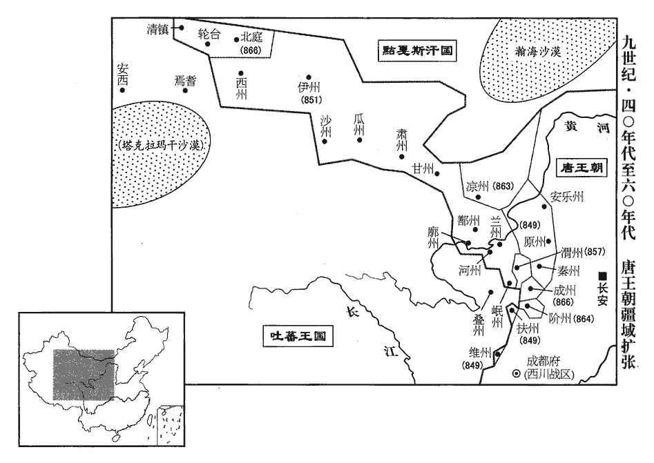 13張義潮發兵略定其旁瓜‹甘肃省安西县›、伊‹新疆哈密市›、西‹新疆吐鲁番市东›、甘‹甘肃省张掖市›、肅‹甘肃省酒泉市›、蘭‹甘肃省兰州市›、鄯、河‹甘肃省临夏市›、岷‹甘肃省岷县›、廓‹青海省化隆县›十州,遣其兄義澤奉十一州圖籍入見,十州并沙州為十一州。見,賢遍翻。宋白曰:瓜州,西至沙州二百八十里,西北至伊州九百里。西州,東至伊州七百五十里。甘州,西至肅州四百二十里。肅州,西至瓜州五百二十六里。蘭州,西至鄯州四百九十里。鄯州,南至廓州二百八十里。河州,東北至蘭州三百里。岷州,北至蘭州狄道縣五百三十四里,西北至河州大夏縣三百六十三里。於是河、湟之地‹甘肃省及青海省东部›盡入于唐。十一月,置歸義軍於沙州,以義潮為節度使、考異曰:唐年補錄、舊紀、義潮降在五年八月。獻祖紀年錄及新紀在十月。按實錄:「五年,二月,壬戌,天德軍奏沙州刺史張義潮、安景旻及部落使閻英達等差使上表,請以沙州降。十月,義潮遣兄義澤以本道瓜、沙、伊、肅等十一州地圖戶籍來獻。河、隴陷沒百餘年,至是悉復故地。十一月,建沙州為歸義軍,以張義潮為節度使,河、沙等十一州觀察、營田、處置等使。」新紀:「五年,十月,沙州人張義潮以瓜、沙、伊、肅、鄯、甘、河、西、蘭、岷、廓十一州歸于有司。」新傳:「三州、七關降之明年,沙州首領張義潮奉十一州地圖以獻,擢義潮沙州防禦使,俄號歸義軍,遂為節度使。」參考諸書,蓋二月義潮使者始以得沙州來告,除防禦使,十月又遣義澤以十一州圖籍來上,除節度使也。今從實錄。新傳云三州降之明年,誤也。十一州觀察使;又以義潮判官曹義金為歸義軍長史。按新書百官志:節度使有行軍司馬、節度副使、判官、支使等;其兼都督、都護,則有長史。