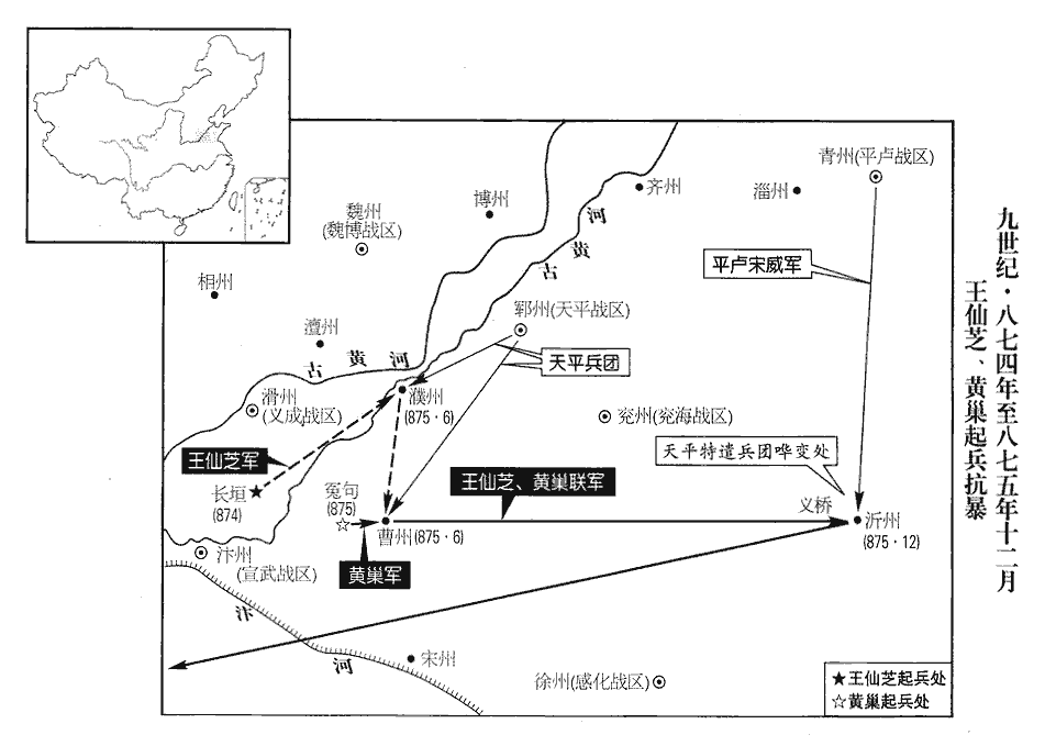 15王仙芝及其黨尚君長攻陷濮州‹山东省鄄城县›、曹州‹山东省定陶县›,濮,博木翻。衆至數萬;天平節度使薛崇出兵擊之,為仙芝所敗。敗,補邁翻。