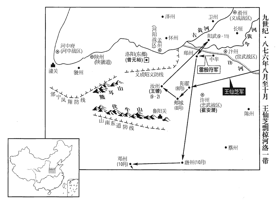 16宋威擊王仙芝於沂州城下,大破之,考異曰:實錄,去年十二月,「宋威自青州與副使曹全晸zhěng進軍擊王仙芝,仙芝敗走。」按仙芝若以去年十二月敗走,中間半年,豈能靜處,蓋實因威除招討使連言之。其實仙芝敗在此月,不在十二月也。仙芝亡去。威奏仙芝已死,縱遣諸道兵,身還青州‹山东省青州市›;百官皆入賀。居三日,州縣奏仙芝尚在,攻剽如故。剽,匹妙翻。時兵始休,詔復發之,復,扶又翻。士皆忿怨思亂。八月,仙芝陷陽翟‹河南省禹州市›、郟城‹河南省郏县›,郟jiá,訖洽翻。詔忠武‹总部设许州河南省许昌市›節度使崔安潛發兵擊之。安潛,慎由之弟也。崔慎由,相宣宗。又昭【章:十二行本「昭」上有「命」字;乙十一行本同;孔本同;張校同。】義‹总部设潞州山西省长治市›節度使曹翔將步騎五千及義成‹总部设滑州河南省滑县›兵衛東都宮,以左散騎常侍曾元裕為招討副使,守東都,又詔山南東道‹总部设襄州湖北省襄樊市›節度使李福選步騎二千守汝‹河南省汝州市›、鄧‹河南省邓州市›要路。仙芝進逼汝州,詔邠寧‹总部设邠州陕西省彬县›節度使李侃、鳳翔‹总部设凤翔府陕西省凤翔县›節度使令狐綯選步兵一千、騎兵五百守陝州‹陕虢道首府·河南省三门峡市›、潼關‹陕西省潼关县›。陝,失冉翻。