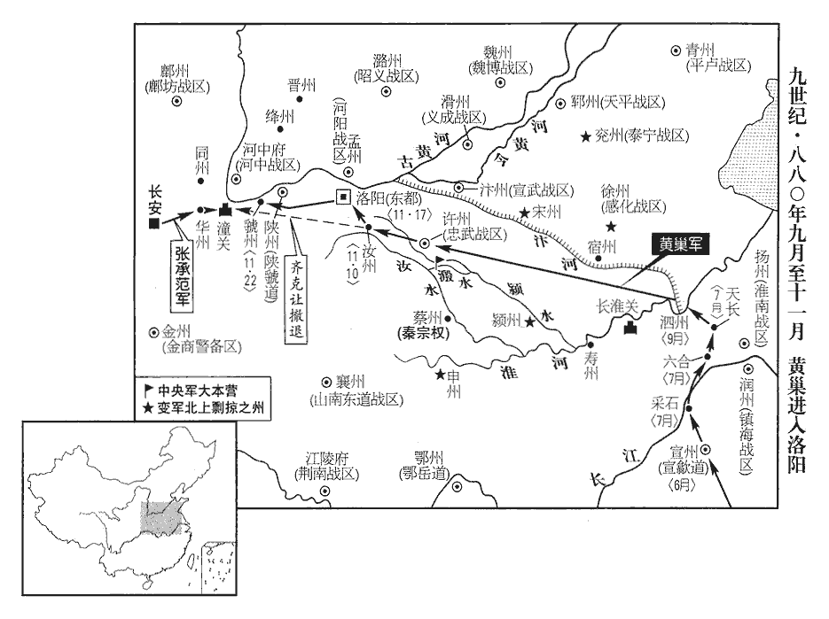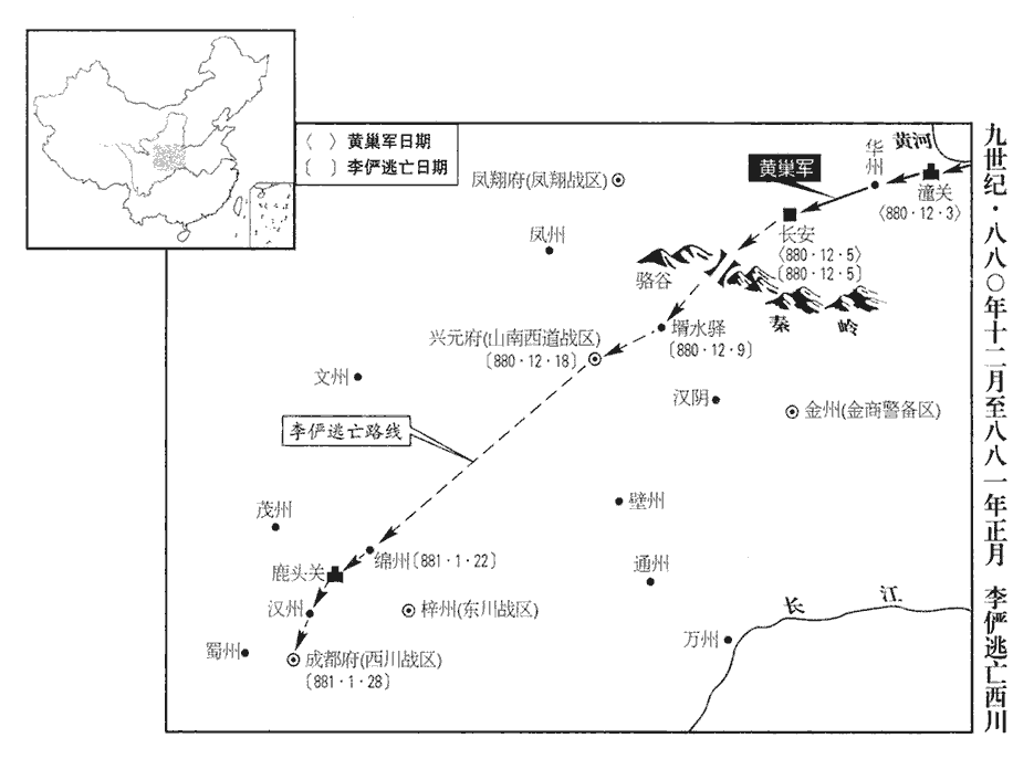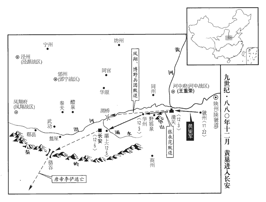 6汝、鄭‹河南省郑州市›把截制置都指揮使齊克讓奏黃巢自稱天補大將軍,轉牒諸軍,云,「各宜守壘,勿犯吾鋒!吾將入東都,即至京邑,自欲問罪,無預眾人。」言自欲問罪於朝廷,於眾人無預也。上召宰相議之。豆盧瑑、崔沆請發關內‹潼关以西›諸鎮及兩神策軍守潼關‹陕西省潼关县›。壬戌‹十二›,日南至。上開延英,對宰相泣下。大盜將至,無以禦之,君相相對灑泣,果何益哉!觀軍容使田令孜奏:「請選左右神策軍弓弩手守潼關,臣自為都指揮制置把截使。」上曰:「侍衛將士,不習征戰,恐未足用。」令孜曰:「昔安祿山搆逆,玄宗‹李隆基›幸蜀以避之。」崔沆曰:「祿山眾纔五萬,比之黃巢,不足言矣。」豆盧瑑曰:「哥舒翰以十五萬眾不能守潼關,事見玄宗、肅宗紀。今黃巢眾六十萬,而潼關又無哥舒之兵。若令孜為社稷計,三川帥臣皆令孜腹心,謂陳敬瑄、楊師立、牛勗也。帥,所類翻。比於玄宗則有備矣。」上不懌,僖宗雖曰童昏,此時此意,豈不知高枕京邑之為樂,越在草莽之為可憂也哉!禍至而後憂之,則無及矣。古之明主居安而思危,所以能常有其安也。謂令孜曰:「卿且為朕發兵守潼關。」為,于偽翻。是日,上幸左神策軍,親閱將士。令孜薦左軍馬軍將軍張承範、右軍步軍將軍王師會、左軍兵馬使趙珂。珂,丘何翻。上召見三人,見,賢遍翻。以承範為兵馬先鋒使兼把截潼關制置使,師會為制置關塞糧料使,珂為句當寨柵使,句,古候翻。當,丁浪翻。令孜為左右神策軍內外八鎮及諸道兵馬都指揮制置招討等使,飛龍使楊復恭為副使。