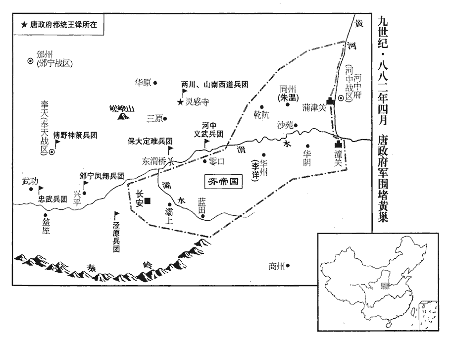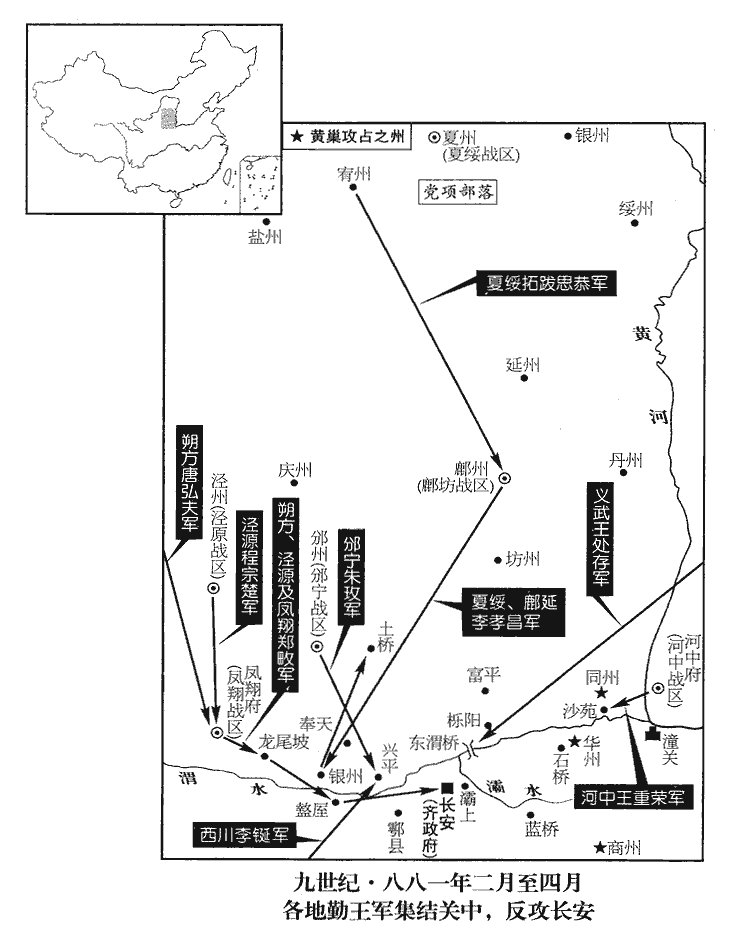14王鐸將兩川、興元之軍屯靈感寺‹陕西省富平县西›,涇原屯京西,易定、河中屯渭北,邠寧、鳳翔屯興平‹陕西省兴平市›,保大、定難屯渭橋‹陕西省高陵县南›,難,乃旦翻。忠武屯武功‹陕西省武功县西›,官軍四集。黃巢勢已蹙,號令所行不出同‹陕西省大荔县›、華‹陕西省华县›。黃巢將朱溫時據同州,李詳據華州,故號令之行止此二州。華,戶化翻。民避亂皆入深山築柵自保,農事俱廢,長安城中斗米直三十緡。賊賣【章:十行本「賣」作「買」;乙十一行本同;孔本同;張校同。】人於官軍以為糧,官軍或執山寨之民鬻之,人直數百緡,以肥瘠論價。