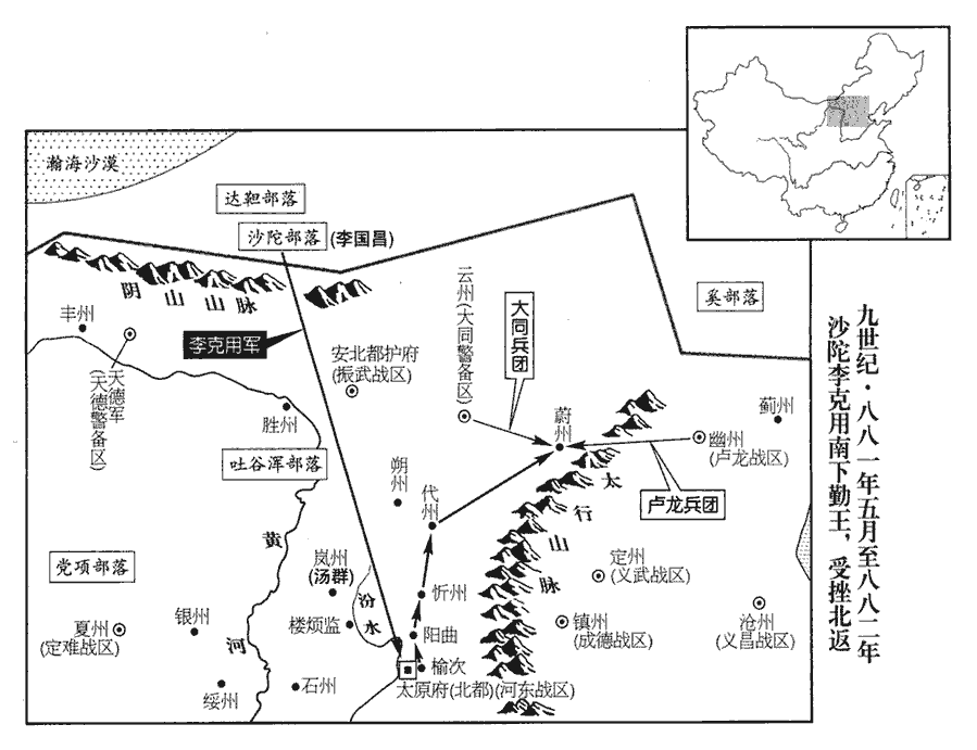 14瞿稹、李友金至代州,募兵踰旬,得三萬人,皆北方雜胡,屯於崞‹山西省原平市北崞阳镇›西,代州崞縣之西也。崞,音郭。獷悍暴橫,獷,古猛翻。悍,下罕翻,又侯幹翻。橫,戶孟翻。稹與友金不能制。友金乃說陳景思曰:說,式芮翻。「今雖有眾數萬,苟無威信之將以統之,終無成功。吾兄司徒父子,勇略過人,為眾所服;驃騎誠奏天子赦其罪,召以為帥,李國昌以平龐勛功檢校司徒。驃騎,唐制武散階極品。唐自高力士以來,宦官多官至驃騎,故以稱景思。則代北之人一麾響應,狂賊不足平也!」景思以為然,遣使詣行在言之;詔如所請。友金以五百騎齎詔詣達靼迎之,李克用入達靼,見上卷廣明元年。李克用帥達靼‹瀚海沙漠南›諸部萬人赴之。考異曰:實録:「陳景斯齎詔入達靼召李克用,軍屯蔚州。克用因大掠雁門以北軍鎮。」薛居正五代史:「先是,景思與李友金發沙陀諸部五千騎南赴京師。友金,即武皇之族父也。中和元年二月,友金軍至絳州,將渡河,刺史瞿稹謂景思曰:『巢賊方盛,不如且還代北,徐圖利害。』四月,友金旋軍鴈門,瞿稹至代州,半月之間,募兵三萬,營於崞縣之西,其軍皆北邊五部之眾,不閑軍法,瞿稹、李友金不能制。友金謂景思云云,景思然之,促奏行在。天子乃以武皇為鴈門節度使,仍令以本軍討賊。李友金發五百騎齎詔召武皇於達靼,武皇即帥達靼諸部萬人趨鴈門。」按景思請赦國昌父子,而獨克用至者,蓋國昌已老,獨使克用來耳。是歲,克用但攻掠太原,又陷忻、代二州。明年十二月,始自忻、代留後除鴈門節度使。蓋此際止赦其罪,復為大同防禦使。及陷忻、代,自稱留後,朝廷再召之,始除鴈門。薛史誤也。新表,「中和二年,以河東忻、代二州隸鴈門節度,更大同節度為鴈門節度,治代州。」此其證也。