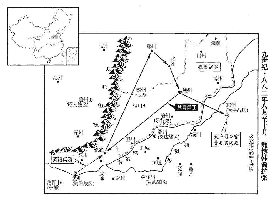18魏博節度使韓簡亦有兼并之志,自將兵三萬攻河陽,敗諸葛爽於脩武‹河南省修武县›;敗,補邁翻。爽棄城走,簡留兵戍之,因掠邢‹河北省邢台市›、洺‹河北省永年县东南旧永年镇›而還。還,從宣翻,又如字。