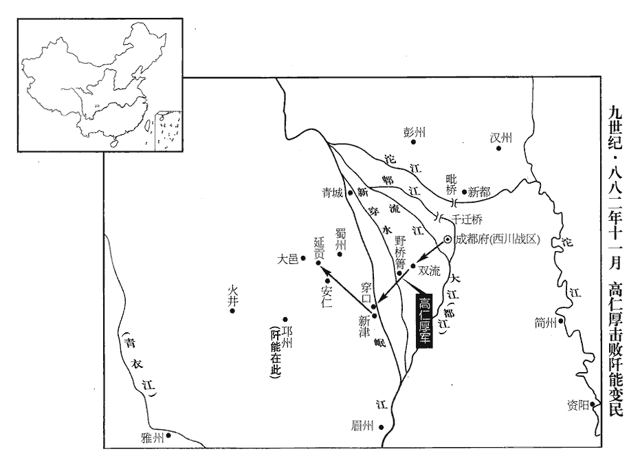 明日,羅夫子至阡能寨,與之謀悉眾決戰;計未定,日向暮,延貢降者至,阡能、羅夫子走馬巡寨,欲出兵,眾皆不應。仁厚引兵連夜逼之,明旦,諸寨知大軍已近,呼譟爭出,執阡能,阡能窘急赴井,為眾所擒,不死;又執羅夫子,羅夫子自剄。剄,古鼎翻。眾挈羅夫子首,縛阡能,驅之前迎官軍,見仁厚,擁馬首大呼泣拜曰:「百姓負冤日久,無所控訴。自諜者還,即仁厚所縱鬻麪者也。百姓引領,度頃刻如朞年。今遇尚書,如出九泉睹白日,已死而復生矣。」讙呼不可止。讙,與諠同。賊寨在他所者,分遣諸將往降之。仁厚出軍凡六日,五賊皆平。按九域志,雙流縣在成都南四十里,自此而南,至新穿口,又南至新津,又南至延貢,又南至阡能寨,度其道里相去,各不過四五十里。高仁厚知蜀民之心非樂於從亂,而脅於五賊之威,因其心而誘導之,故脅從者皆望風降服,師不留行而五賊平矣。考異曰:張𩇕jìng耆舊傳:「中和三年冬,千能轉盛,官軍戰即不利。陳敬瑄乃遣仁厚討之。十一月五日,仁厚進發,六日,擒羅渾擎,七日,擒句胡僧,得韓求首級,九日,擒千能,得羅夫子首級。十一月二十二日回戈,自城北門入。三日大設。五日議功。高公自檢校兵部尚書檢校左僕射,授眉州刺史。」張𩇕書語雖俚淺,或有抵牾,然叙事甚詳。苟無此書,則仁厚功業悉沉沒矣。句延慶傳:「中和二年,仁厚梟五賊之首,凱旋歸府。冬十二月戊寅,皇帝御大玄樓,高仁厚與將校等於清遠橋朝見。至後三日,大設,高仁厚除授眉州刺史。」延慶不知據何書知千能敗在二年冬,然要之仁厚擒韓秀昇在三年十月前,則擒千能必更在前矣。十一月,己亥朔,無戊寅,日必誤也。實錄:「二年十月,草賊阡能於蜀州敗官軍,陳敬瑄遣高仁厚討之。」實錄見句傳叙討阡能事,承十月癸丑發峽路收討韓秀昇下,因附之。十月亦誤也。實錄又曰:「十二月,仁厚以阡能首來獻,帝御大玄樓宣慰回戈將士,以仁厚為檢校工部尚書、眉州防禦使。」亦因句傳而去其日。又此年十月戊辰,昇眉、漢、彭、綿等州並為防禦使,故改刺史為防禦耳。今高仁厚擒阡能既不知決在何年月,故因實錄附於此。每下縣鎮,輒補鎮遏使,使安集戶口。
