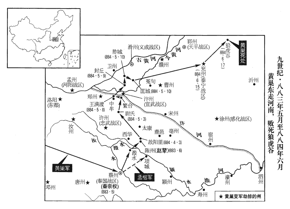 39趙犨‹陈州›遣人間道求救於鄰道,間,古莧翻。於是周岌‹忠武总部许州›、時溥‹感化总部徐州›、朱全忠‹宣武总部汴州›皆引兵救之。全忠與黃巢之黨戰於鹿邑‹河南省鹿邑县›,敗之,斬首二千餘級,遂引兵入亳州‹安徽省亳州市›而據之。鹿邑,後魏陳留武平縣也,隋開皇十八年,更名鹿邑,唐屬亳州。九域志:在州西一百三十里。敗,補邁翻。