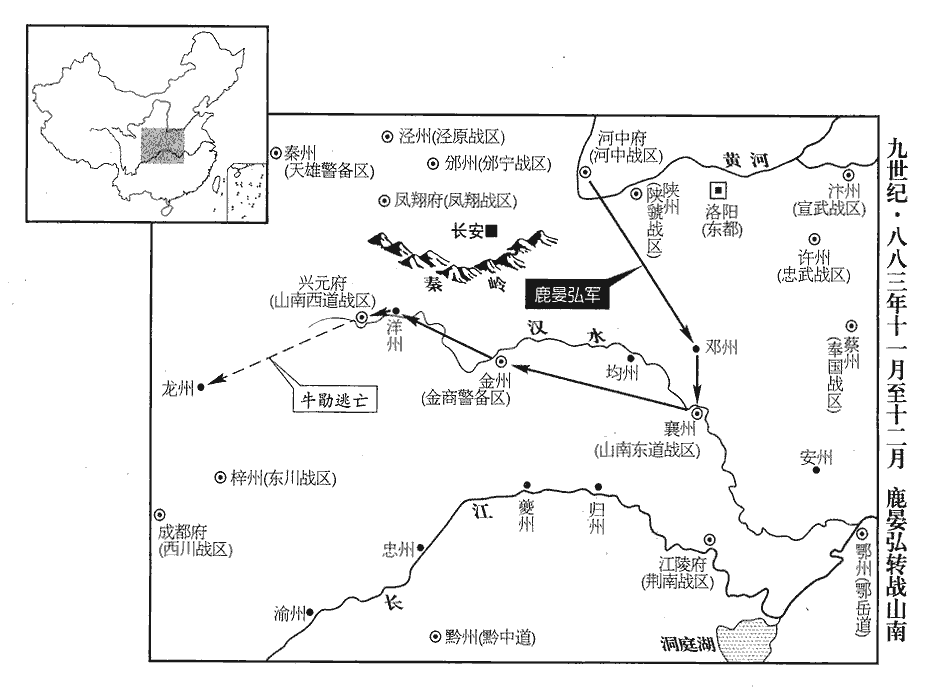 36忠武大將鹿晏弘帥所部自河中南掠襄‹湖北省襄樊市›、鄧‹河南省邓州市›、金‹陕西省安康市›、洋‹陕西省洋县›,所過屠滅,聲云西赴行在‹成都›。宋白曰:金州,漢漢中郡之西城縣也。魏文帝置西城郡,後改魏興郡;梁置北梁州,尋改為南梁州;西魏置東梁州,因其地出金,改為金州。洋州,漢成固縣地,後漢封班超於此。晉為南鄉縣,尋改西鄉,西魏置洋州。帥,讀曰率。洋,音祥。十二月,至興元‹陕西省汉中市›,逐節度使牛勗,勗奔龍州‹四川省平武县东南›西山。龍州西山,松、茂二州界,時已沒於蠻中。晏弘據興元,自稱留後。