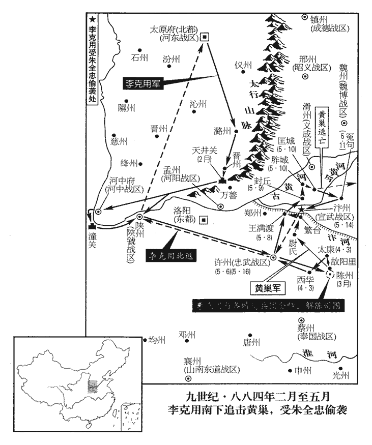 4黃巢兵尚強,周岌、時溥、朱全忠不能支,共求救於河東‹总部设太原府山西省太原市›節度使李克用。二月,克用將蕃、漢兵五萬出天井關‹山西省晋城市南›;河陽‹总部设孟州河南省孟州市›節度使諸葛爽辭以河橋不完,謂河陽橋也。屯兵萬善‹河南省沁阳市北›以拒之。克用乃還兵自陝‹河南省三门峡市›、河中‹山西省永济市›渡河而東。考異曰:唐末見聞錄:「晉王三月十三日發大軍討黃巢。」太祖紀年錄:「正月,太祖帥師五萬自澤潞將下天井關,河陽屯萬善,乃改轅蒲、陝渡河。」薛居正五代史但云四年春。按四月已與巢戰,三月十三日發晉陽,似太晚。又克用表云:「昨二月內,頻得陳、許、徐、汴書牒。」今從舊紀。又克用自訴上表云:「遂從陝服,徑達許田。」是於蒲、陝兩道度兵也。