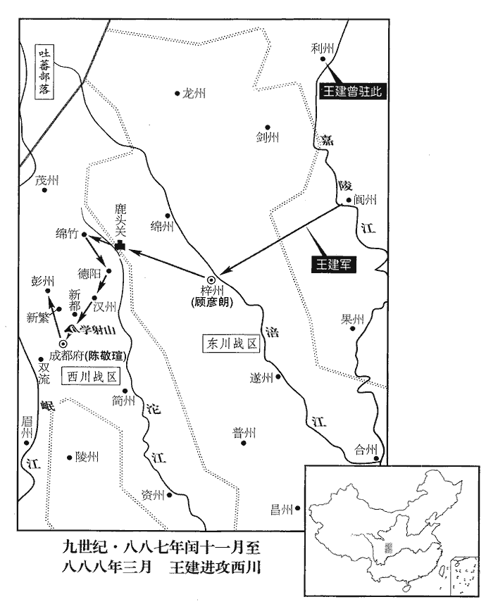 14王建攻彭州‹四川省彭州市›,陳敬瑄‹西川战区,总部设成都府四川省成都市›救之,乃去。建大掠西川,十二州皆被其患。西川統益、彭‹四川省彭州市›、蜀‹四川省崇州市›、漢‹四川省广汉市›、嘉‹四川省乐山市›、眉‹四川省眉山县›、邛‹四川省邛崃市›、簡‹四川省简阳市›、資‹四川省资中县›、雅‹四川省雅安市›、黎‹四川省汉源县›、茂‹四川省茂县›十二州。被,皮義翻。