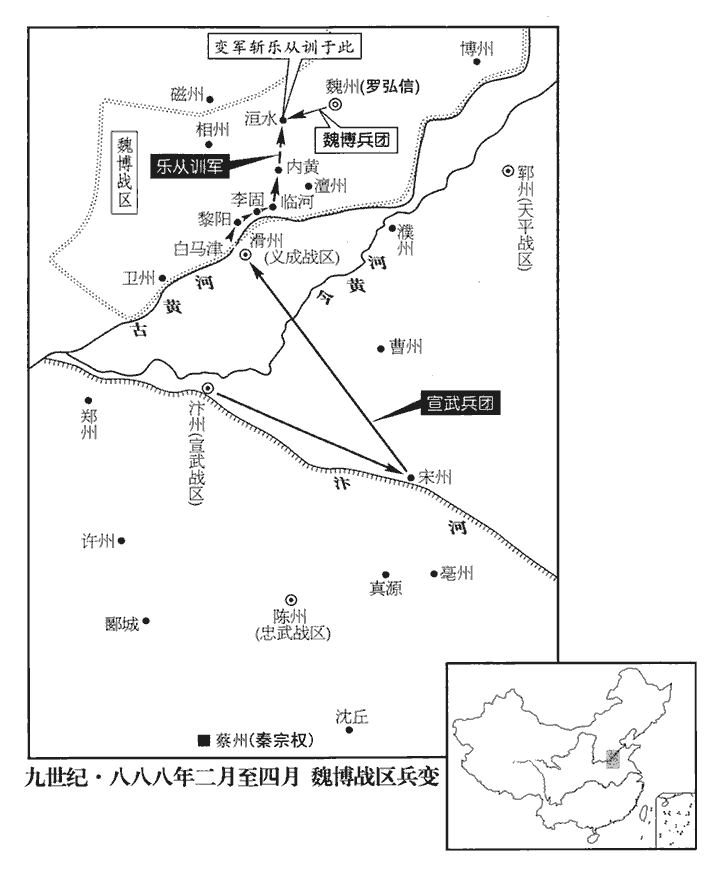 12朱全忠裹糧於宋州,將攻秦宗權;會樂從訓來告急,乃移軍屯滑州‹河南省滑县›,遣都押牙李唐賓等將步騎三萬攻蔡州,遣都指揮使朱珍等分兵救樂從訓。考異曰:薛居正五代史珍傳曰:「珍軍于內黃,敗樂從訓萬餘人。」按珍往救從訓而云敗從訓,誤也。葛從周傳曰:「從太祖渡河,拔黎陽、李固、臨河等鎮,至內黃,破魏軍萬餘眾。」據薛史紀、傳,皆云太祖遣朱珍等救從訓,獨從周傳云從太祖,恐誤也。自白馬‹滑州州政府所在县·河南省滑县›濟河,下黎陽‹河南省浚县›、臨河‹河南省濮阳市西›、李固‹应在河南省浚县附近›三鎮;元豐九域志,澶州有臨河縣,在州西六十里。魏州魏縣有李固鎮。薛史晉紀:鄴西有柵曰李固,清淇合流在其側。進至內黃,敗魏軍萬餘人,獲其將周儒等十人。敗,補邁翻。
