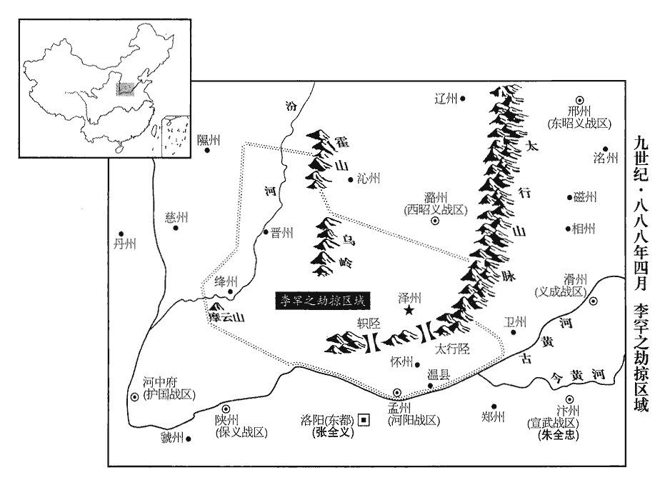 李罕之為澤州刺史,領河陽節度使。罕之留其子頎事克用,頎,渠希翻。身還澤州,專以寇鈔為事,鈔,楚交翻。自懷‹河南省沁阳市›、孟、晉‹山西省临汾市›、絳‹山西省新绛县›數百里間,州無刺史,縣無令長,田無麥禾,邑無煙火者,殆將十年。令,力正翻。長,知兩翻。河中、絳州之間有摩雲山,絕高,民保聚其上,寇盜莫能近,近,其靳翻。罕之攻拔之,時人謂之「李摩雲」。