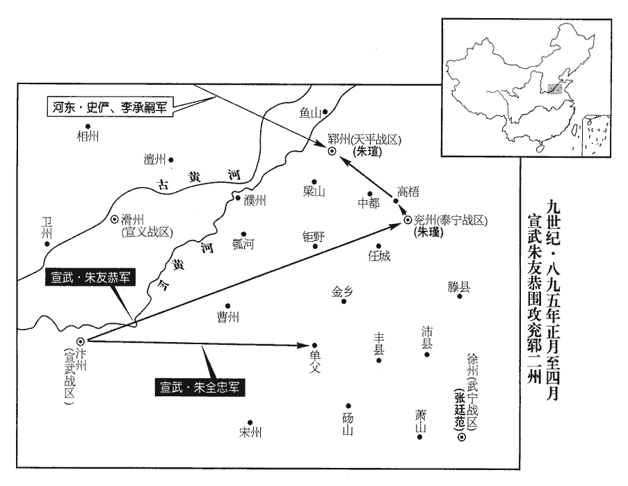 9朱【章:十二行本「朱」上有「己酉‹二十一›」二字;乙十一行本同;孔本同;張校同;退齋校同。】全忠軍于單父‹山东省单县›,單父縣,時帶單州。單,音善。父,音甫。為朱友恭聲援。朱友恭時圍朱瑾於兗州‹泰宁战区总部所在·山东省兖州市›。