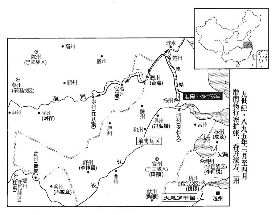 17錢鏐、鍾傳‹镇南总部洪州›、杜洪‹武昌总部部州›畏楊行密之強,皆求援於朱全忠;其後鍾、杜皆不能保其土,而錢氏獨傳子及孫,以此知有國有家者,久近存乎其人。全忠遣許州‹河南省许昌市›刺史朱友恭將兵萬人渡淮,聽以便宜從事。