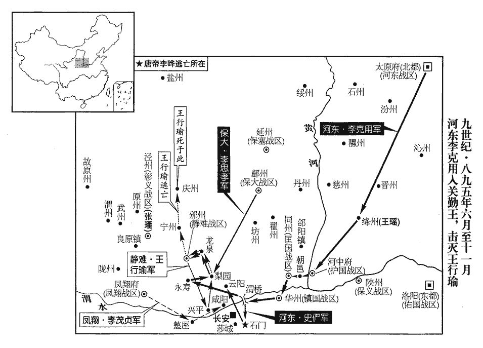 壬戌‹七›,李克用入同州,崔昭緯、徐彥若、王摶tuán至莎城。甲子‹九›,上徙幸石門鎮‹陕西省蓝田县西南›,路振九國志:昭宗出啟夏門,駐華嚴寺,晡晚,出幸南山之莎城,駐于石門山之佛寺。與此稍異。命薛王知柔與知樞密院劉光裕還京城,制置守衛宮禁。丙寅‹十一›,李克用遣節度判官王瓌奉表問起居。丁卯‹十二›,上遣內侍郗廷昱新書百官志:內侍在內侍監之下,內常侍之上,員四人,從四品上。郗,丑之翻。齎jí詔詣李克用軍,令與王珂各發萬騎同赴新平‹邠州州政府所在县·陕西省彬县›。赴新平以討王行瑜。邠州新平郡。又詔彰義‹总部设泾州甘肃省泾川县›節度使張鐇以涇原兵控扼鳳翔‹陕西省凤翔县›。