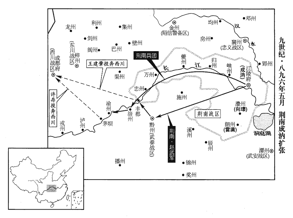 24荊南‹总部设江陵府湖北省江陵县›節度使成汭‹郭禹›與其將許存泝江略地,盡取濱江州縣,武泰‹总部设黔州重庆市彭水县›節度使王建肇棄黔州,收餘眾保豐都‹重庆市丰都县›。豐都,漢巴郡枳縣地,後漢置平都縣,因山以名縣也。梁置臨江郡,隋廢郡為縣。義寧二年,分臨江置豐都縣。唐屬忠州。九域志:在州西九十里。存又引兵西取渝‹重庆市›、涪‹重庆市涪陵区›二州,汭以其將趙武為黔中留後,存為萬州‹重庆市万州区›刺史。