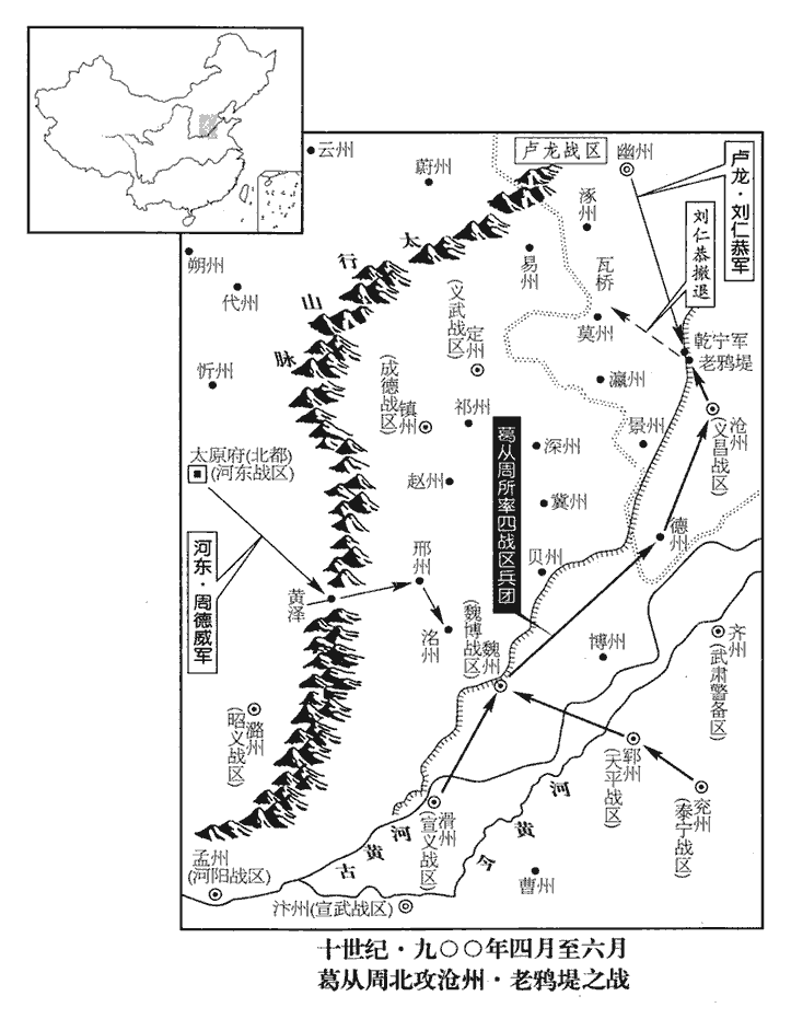11劉仁恭‹卢龙总部幽州›將幽州兵五萬救滄州,營於乾寧軍‹河北省青县›,乾寧軍,在滄州西一百里,蓋乾寧間始置此軍也。宋白曰:乾寧軍,本古蘆臺軍地,後為馮橋鎮,臨御河之岸,接滄、幽二州之界。周顯德六年,收復關南,始建為乾寧軍。九域志云:太平興國七年始置軍。葛從周‹宣武总部汴州›留張存敬、氏叔琮守滄州寨,自將精兵逆戰於老鵶堤‹河北省青县东南›,老鵶堤,在乾寧軍東南。大破仁恭,斬首三萬級,仁恭走保瓦橋‹河北省雄县›。瓦橋,在涿州歸義縣南,至莫州三十里。宋白曰:瓦橋亦謂之瓦子濟橋,在涿州南,易州東。周顯德收復三關,以其地控幽、薊,建為雄州。秋,七月,李克用復遣都指揮使李嗣昭將兵五萬攻邢、洺以救仁恭,敗汴軍於內丘‹河北省内丘县›。復,扶又翻。敗,補邁翻;下同。范成大北使錄,內丘縣至邢州三十五里。考異曰:唐太祖紀年錄:「七月,嗣昭攻堯山,至內丘,遇汴軍三千,戰敗之,擒其將李瓌。」薛居正五代史後唐紀與紀年錄同。惟唐末見聞錄,八月二十五日,嗣昭領馬步五萬取馬嶺,進軍下山東,某日山東告捷,收得洺州。九月二日,嗣昭兵士失利卻回。」新紀:「八月,庚辰,陷洺州。」薛史唐紀:「九月,嗣昭棄城歸。」蓋據此也。按編遺錄,八月中云,「前月二十五日,上於毬場饗士,忽有大風驟起,占者云賊風。果於是時李進通領蕃寇出攻洺州。」然則嗣昭出兵,乃七月二十五日也。編遺錄又曰:「八月,乙丑,出兵救洺州。」乙丑,九日也。又進通敗奔歸太原在八月,見聞錄誤。今從編遺錄、紀年錄、梁紀。王鎔‹成德总部镇州›遣使和解幽、汴,會久雨,朱全忠召從周還。滄州下濕,雨水,難以駐軍,且欲救邢、洺,故召還。