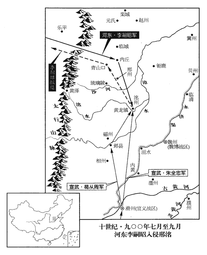16九月,葛從周自鄴縣‹河北省临漳县西南邺镇›渡漳水‹流经邺县城北›,營於黃龍鎮‹河北省永年县西南›;朱全忠自將中軍三萬涉洺水‹古漳水支流›置營。李嗣昭棄城走,棄洺州城而走。從周設伏於青山口‹河北省邢台市西北›,邀擊,大破之。考異曰:唐太祖紀年錄:「葛從周攻洺州,嗣昭棄城而歸。是役也,王郃郎、楊師悅陷賊,洺州復為汴有。」唐末見聞錄:「九月二日,嗣昭兵士失利卻回,被汴州捉到王郃郎。」編遺錄、薛居正五代史梁紀:「八月,帝遣葛從周屯黃龍鎮,親領中軍涉洺而寨,晉人懼而宵遁,洺州復平。」唐紀:「九月,汴帥自將兵三萬圍洺州,嗣昭棄城而歸,葛從周伏青山口,嗣昭軍不利。」實錄:「九月,嗣昭棄洺州,敗於青山口。」今從唐末見聞錄、唐紀、實錄。按考異所錄唐紀,蓋後唐紀。