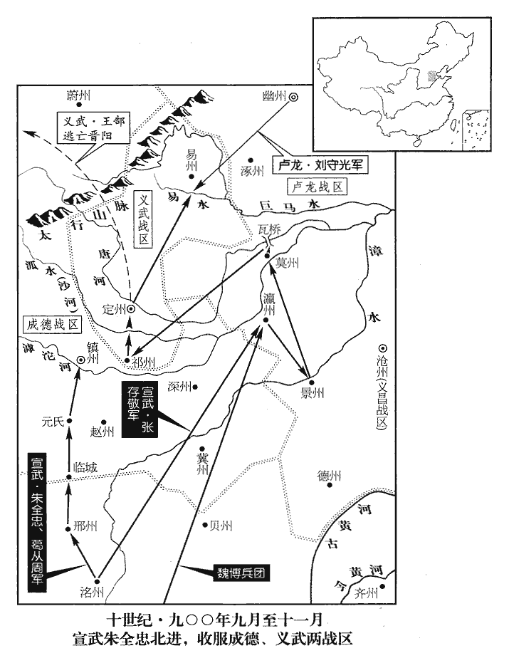 劉仁恭遣其子守光將兵救定州,軍於易水‹海河支流·流经河北省易县南›之上;易水,在易州遂城縣界。遂城縣於宋為安肅軍。昔燕太子丹送荊軻於易水之上,即此地。全忠遣張存敬襲之,殺六萬餘人。由是河北‹河北平原›諸鎮皆服於全忠。史言河北諸鎮皆羈服於全忠,全忠不能并有其地也。