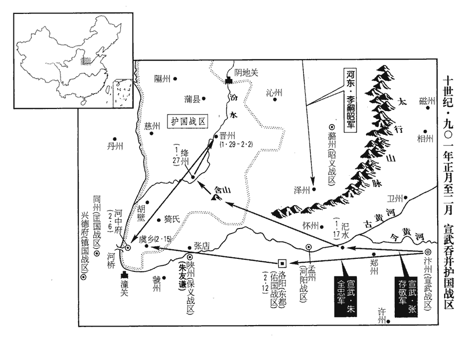 4朱全忠既服河北,欲先取河中以制河東,己亥‹十六›,召諸將謂曰:「王珂‹护国总部河中府›駑材,恃太原自驕汰。駑,音奴。王珂恃李克用翁壻之親而不事朱全忠,故云然。吾今斷長蛇之腰,諸君為我以一繩縛之!」言河東、河中兩鎮連衡以通長安,今若取河中,是斷李克用之腰也。斷,丁管翻。為,于偽翻。庚子‹十七›,遣張存敬將兵三萬自汜水‹河南省荥阳市汜水镇西›渡河出含山‹山西省绛县西南冷口›路以襲之,含山,在絳州東。張濬之敗也,出含口至河陽,渡河西歸,即此路。全忠以中軍繼其後;戊申‹二十五›,存敬至絳州‹山西省新绛县›。晉‹山西省临汾市›、絳‹山西省新绛县›不意其至,皆無守備,庚戌‹二十七›,絳州刺史陶建釗降之;釗,音昭。降,戶江翻。壬子‹二十九›,晉州刺史張漢瑜降之。全忠遣其將侯言守晉州,何絪守絳州,絪,音因。屯兵二萬以扼河東援兵之路。朝廷恐全忠西入關‹蒲津关›,急賜詔和解之;全忠不從。