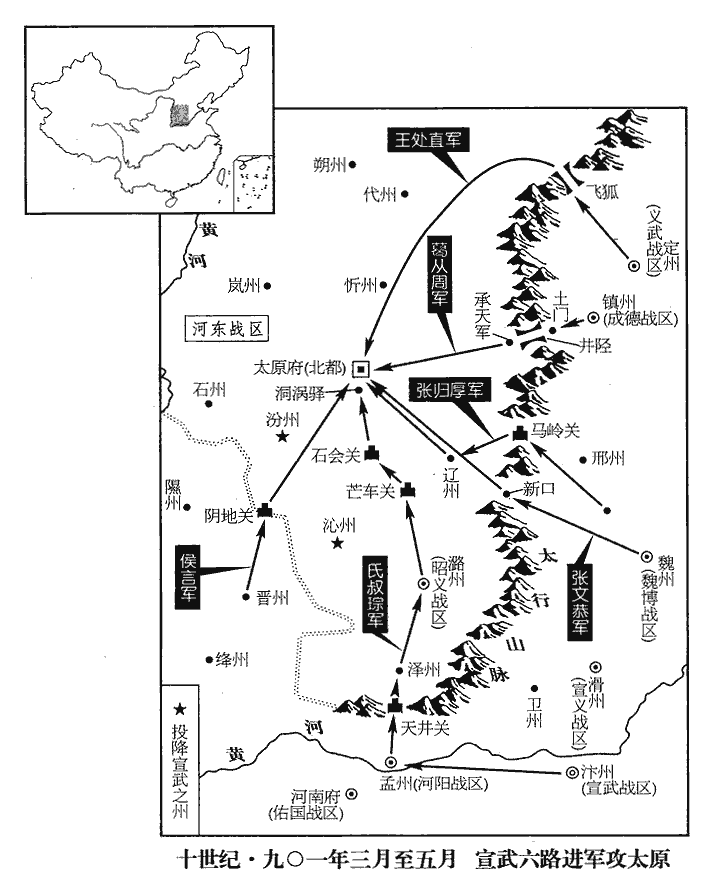 7朱全忠‹朱温·宣武总部汴州›遣葛從周帥兗、鄆、滑、魏四鎮兵十萬擊劉仁恭‹卢龙总部幽州›,帥,讀曰率。五月,庚寅‹四›,拔德州‹山东省陵县›,斬刺史傅公和;己亥‹十三›,圍劉守文於滄州‹义昌战区总部所在·河北省沧州市东南›。仁恭復遣使卑辭厚禮求援於河東,復,扶又翻。李克用遣周德威將五千騎出黃澤‹山西省左权县东南›,攻邢‹河北省邢台市›、洺‹河北省永年县东南旧永年镇›以救之。黃澤關,在遼州遼山縣黃澤嶺。