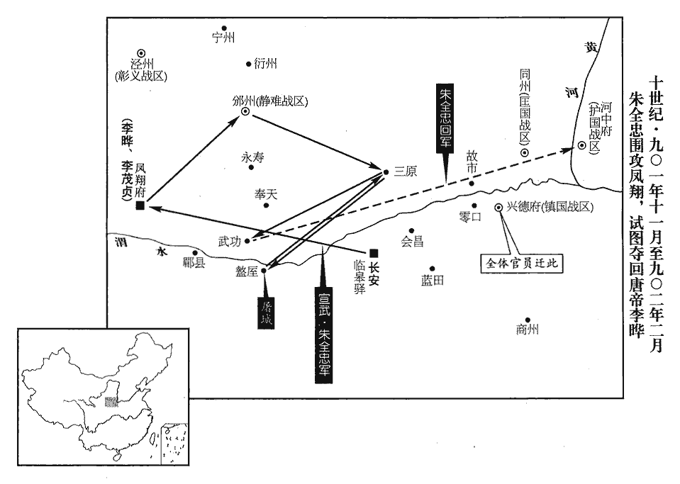 壬子‹四›,韓全誨等陳兵殿前,言於上曰:「全忠以大兵逼京師,欲劫天子幸洛陽,求傳禪;臣等請奉陛下幸鳳翔,收兵拒之。」上不許,杖劍登乞巧樓。全誨等逼上下樓,上行纔及壽春殿,李彥弼已於御院縱火。御院,天子及后妃所居之地。是日冬至,上獨坐思政殿,翹一足,一足蹋闌干,蹋,與踏同。闌干,殿檻也。庭無群臣,旁無侍者。頃之,不得已,與皇后、妃嬪、諸王百餘人皆上馬,慟哭聲不絕,出門,回顧禁中火已赫然。是夕,宿鄠縣‹陕西省户县›。九域志:鄠縣,在長安南六十里。考異曰:續寶運錄:「其年十月,朱全忠發士馬;十一月,入長安。聖上幸鳳翔,宰臣裴諗shěn、翰林學士令狐渙等扈從。其皇后王氏及千官、太子、玉印、龍服,並是汴州迎在華州,相次脩東都宮室,旋迎赴東都。其年十一月初,鳳翔士馬入京,劫掠街西諸坊寶貨士女至甚。及七日,汴州士馬入京赴救,長安士庶並走,攢在開化坊。」其說妄謬,今不取。