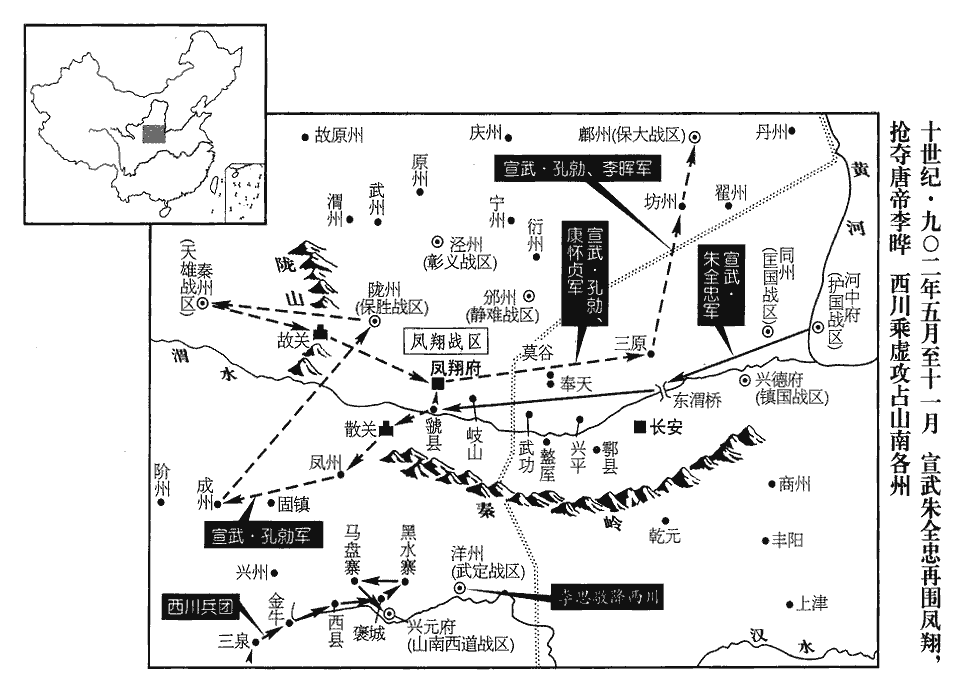 1春,正月,癸丑‹六›,朱全忠‹朱温·宣武总部汴州›復屯三原‹陕西省三原县东北›,又移軍武功‹陕西省武功县西›。將復逼鳳翔也。宋白曰:三原縣,本漢池陽縣地,苻堅於嶻jié嶭niè北置三原護軍,以其地南有酆原,西有孟侯原,北有白鹿原,是為三原。後魏太平真君七年,罷護軍,置縣。河東‹总部太原府›將李嗣昭、周德威攻慈‹山西省吉县›、隰‹山西省隰县›,以分全忠兵勢。朱全忠兼有河中,慈、隰二州,其巡屬也。