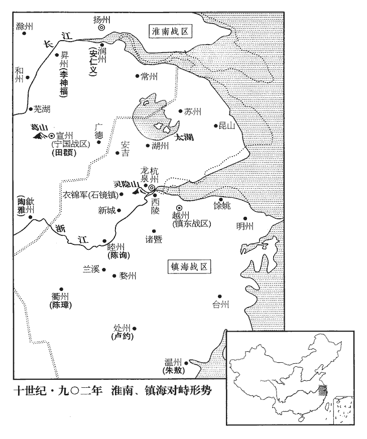 43田頵急攻杭州,仍具舟將自西陵‹浙江省萧山市西北西兴镇›渡江‹钱塘江›;錢鏐遣其將盛造、朱郁拒破之。