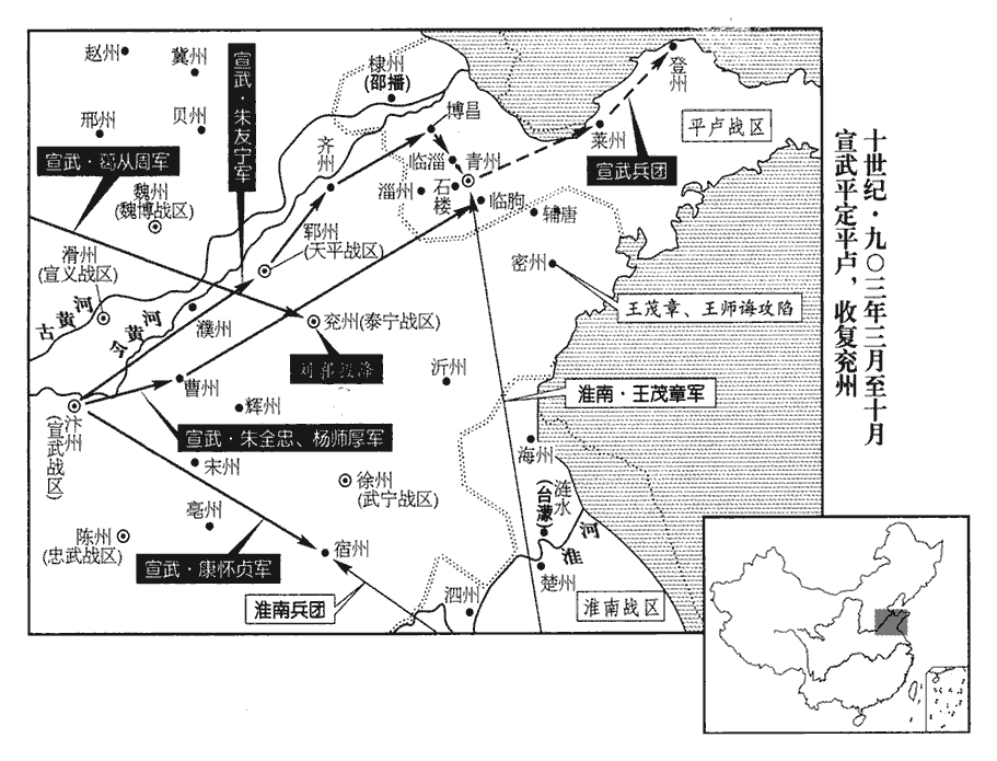 13三月,戊午‹十七›,朱全忠至大梁‹汴州州政府所在城·河南省开封市›。王師範弟師魯圍齊州‹山东省济南市›,朱全忠并兗、鄆,遂兼有齊州。九域志:兗州北至齊州三百六十里。朱友寧‹宣武,总部汴州›引兵擊走之。師範遣兵益劉鄩軍,友寧擊取之。由是兗州援絕,葛從周‹泰宁,总部兖州›引兵圍之。劉鄩取兗州見上卷本年正月。友寧進攻青州;戊辰‹二十七›,全忠引四鎮‹宣武、宣义总部滑州›、天平总部郓州、护国总部河中府及魏博‹总部魏州›兵十萬繼之。