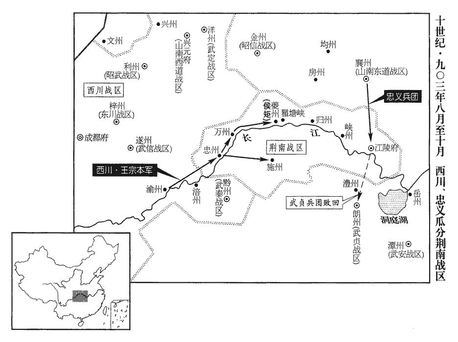 40初,夔州‹重庆市奉节县›刺史侯矩從成汭救鄂州,汭死,矩奔還。成汭死見上四月。會王宗本‹谢从本›兵至,【章:十二行本「至」下有「甲戌」二字;乙十一行本同;孔本同;退齋校同。】矩以州降之,宗本遂定夔、忠‹重庆市忠县›、萬‹重庆市万州区›、施‹湖北省恩施市›四州。夔、忠、萬,荊南巡屬;施,黔中巡屬。王建‹西川总部成都府›復以矩為夔州刺史,更其姓名曰王宗矩。更,工衡翻。宗矩,易州‹河北省易县›人也。蜀之議者,以瞿唐‹重庆市奉节县东›,蜀之險要,瞿唐峽,在夔州東一里,舊名西陵峽;乃三峽之門,兩崖對峙,中貫一江,望之如門。乃棄歸‹湖北省秭归县›、峽‹湖北省宜昌市›,屯軍夔州。荊南自此止領荊、歸、峽三州。