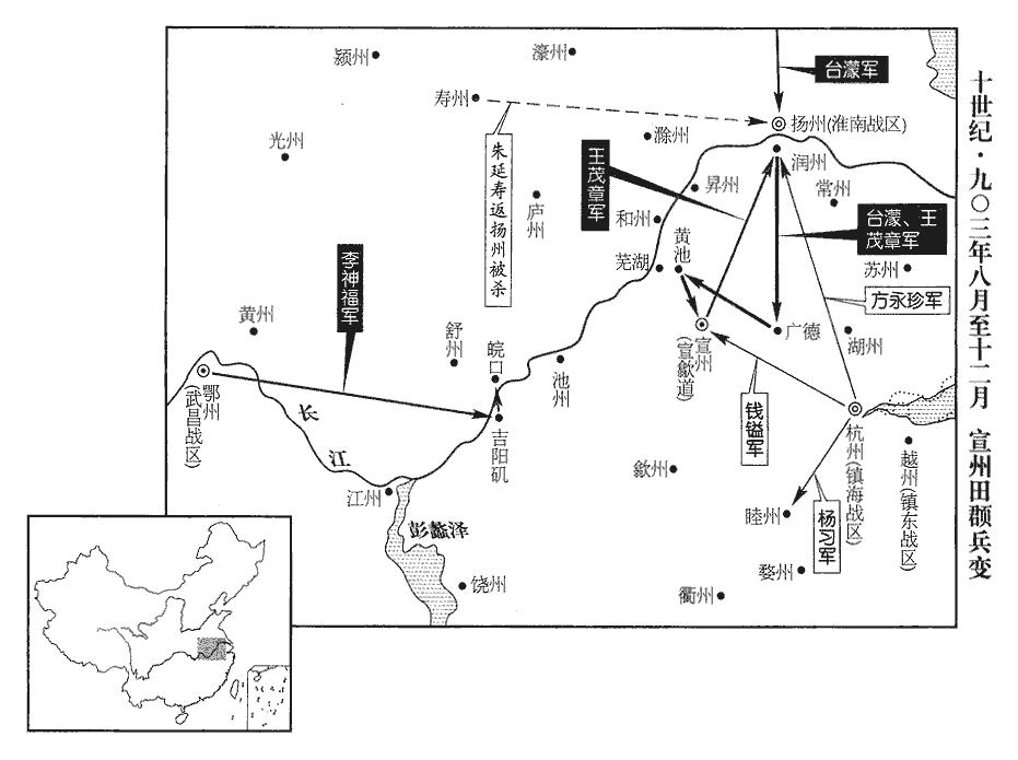 39田頵聞臺濛將至,自將步騎逆戰,留其將郭行悰cóng以精兵二萬及王壇、汪建水軍屯蕪湖‹安徽省芜湖市›,悰,徂宗翻。蕪湖,漢古縣。晉氏南渡,以上黨、襄垣遺民僑立郡縣於蕪湖,江左遂為襄垣縣;隋廢襄垣入當塗;至唐,蕪湖之地入當塗、太平二縣界,唐末,始復置蕪湖縣,屬宣州;今以屬太平州。九域志:在太平州西南六十五里。以拒李神福。覘者言:「濛營寨褊小,纔容二千人。」頵易之,覘,昌占翻,又丑豔翻。褊biǎn,補典翻。易,以豉翻。不召外兵。濛入頵境‹宁国战区,总部设宣州安徽省宣州市›,番陳而進,番陳者,分兵為數部,更番列陳,整兵而後進,以備倉猝薄戰。陳,讀曰陣。軍中笑其怯,濛曰:「頵宿將多謀,不可不備。」將,即亮翻。冬,十月,戊辰‹二›,與頵遇於廣德‹安徽省广德县›,九域志:廣德西至宣州一百八十里。宋白曰:廣德縣,秦鄣郡地,漢為故鄣縣。濛先以楊行密書徧賜頵將,皆下馬拜受;濛因其挫伏,挫伏者,言其將士之氣摧挫而厭伏也。縱兵擊之,頵兵遂敗。又戰于黃池‹安徽省当涂县东南黄池镇›,兵交,濛偽走;頵追之,遇伏,大敗,奔還宣州城守,濛引兵圍之。頵亟召蕪湖兵還,不得入。郭行悰、王壇、汪建及當塗‹安徽省当涂县›、廣德諸戍皆帥其眾降。帥,讀曰率。行密以臺濛已破田頵,命王茂章復引兵攻潤州。知臺濛兵力足以制田頵,故命王茂章復攻安仁義。復,扶又翻。